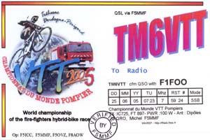 L’organisation du 10ème Championnat du monde de VTT des Pompiers, à Trélissac, fut l’occasion de mettre en place une station et de trafiquer avec un indicatif spécial. Patrick F5OVZ, se chargea de prendre contact avec le comité d’organisation et nous obtenions un stand couvert sur le site. Jean-Charles F8AOW, lui se chargea sur place de la logistique. L’administration nous accorda l’indicatif TM6VTT, et il ne nous restait plus qu’à démarrer l’activité pour le week-end (25 et 26 juin 2005). 315 QSO réalisés avec une propagation exécrable. Le dimanche après-midi, beaucoup de nos appels restèrent sans réponse et nous rangions le matériel plus tôt que prévu. |